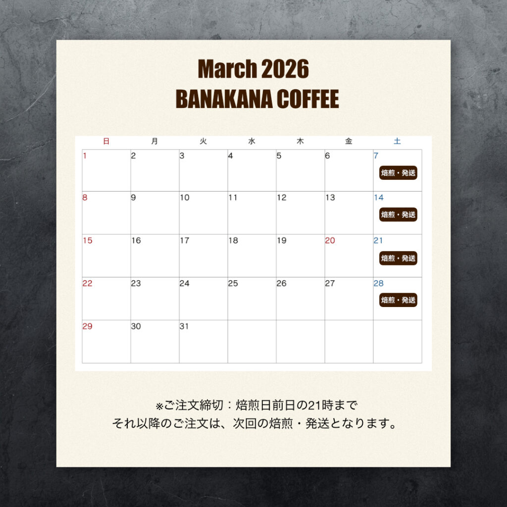 焙煎日カレンダー 2026年3月焙煎日カレンダー banakana 2026年1月4日 / 2026年3月15日 2026年3月の焙煎日は下記の通りです。 ご注文の締切は焙煎日前日の21時までとなっております。また、注文量が多い場合は焙煎日翌日以降の対応となりますのでご了承ください。
