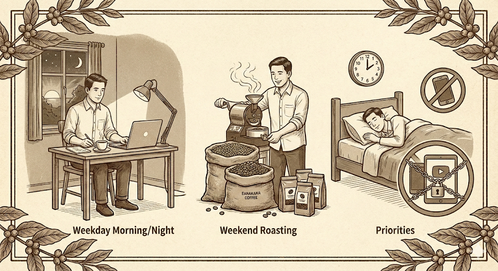 焙煎以外の、例えば動画作成、リール作成、写真撮影、それからこのような記事の執筆に関しては、平日の仕事前の朝や、逆に仕事後の夜など、空いている隙間時間に少しずつ進めることが多い。